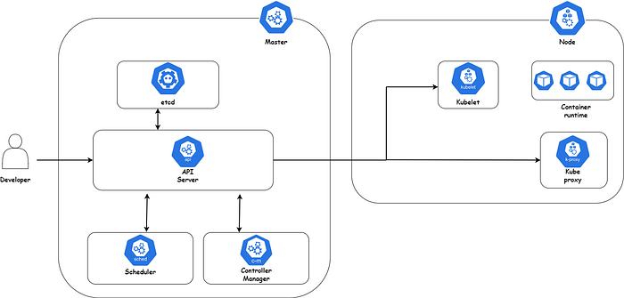 - Worker Node: Kubernetes runs your workload by placing containers into Pods to run on Nodes. A node may be a virtual or physical machine, depending on the cluster. Each node is managed by the control plane and contains the services necessary to run Pods.